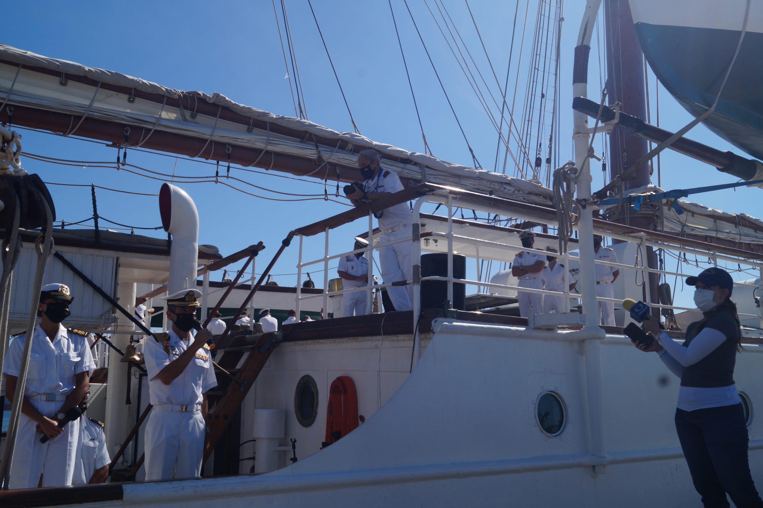 En rueda de prensa a distancia, que ofreció a su llegada el Comandante del bergatin Santiago Colza, dijo que este buque realiza una travesía a lo largo del mundo de once meses y la finalidad es de conmemorar el V centenario de la primera circunnvegación a la tierra, gesta que emprendió en el siglo XVI Fernando de Megallanes, mismo que concluyó Juan Sebastián de Elcano.