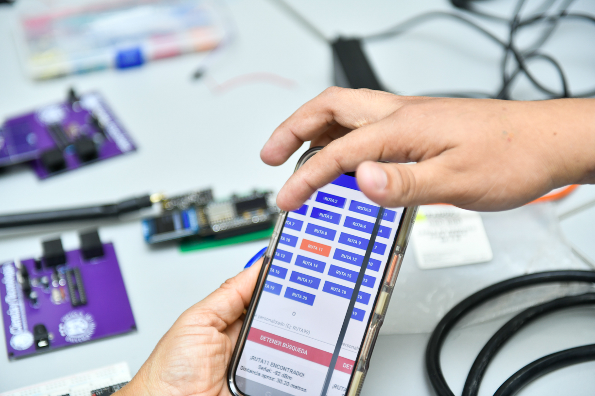 equipo universitario se concentra en el dispositivo que viajará en las unidades del transporte